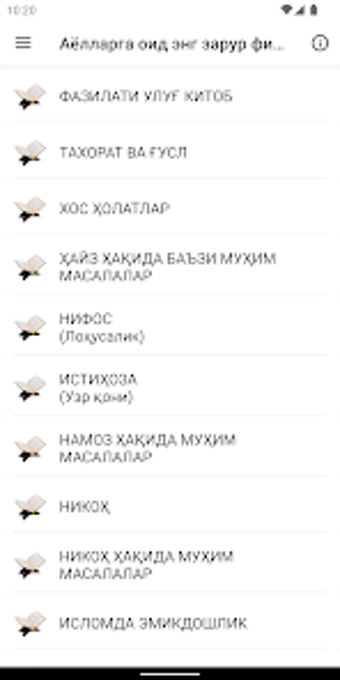 "Aёлларга оид энг зарур фиқҳи" เป็นแอปพลิเคชัน Android ที่พัฒนาโดย Islomiy dasturlar นั้นเป็นแอปพลิเคชันการศึกษาและอ้างอิงฟรีที่อยู่ในหมวดหมู่หนังสือ แอปพลิเคชันนี้อิงอยู่บนบทความที่เผยแพร่ในส่วน "Women's Page" และ "Special Legal Issues" ของวารสาร "Hidoyat" ในปี 1990 ถึงต้นปี 2000.